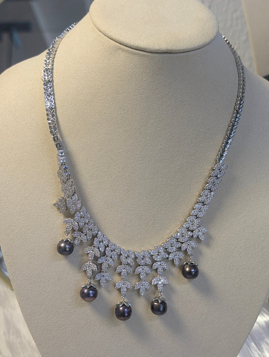 Royal Black Pearl Necklace with Diamond-Leaf Design